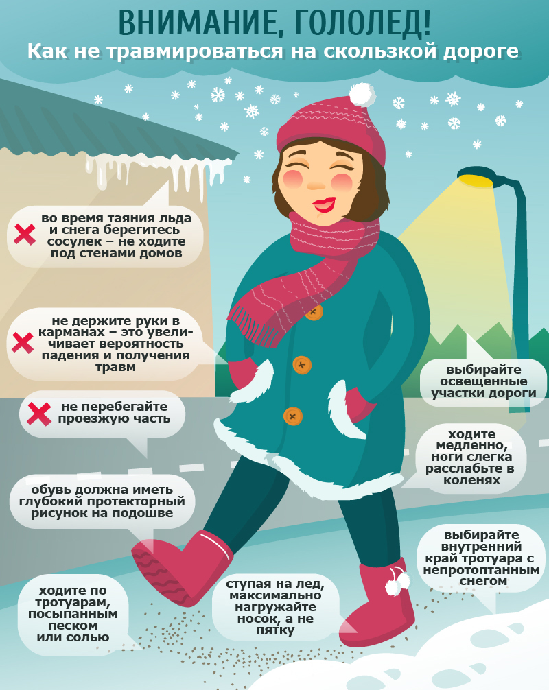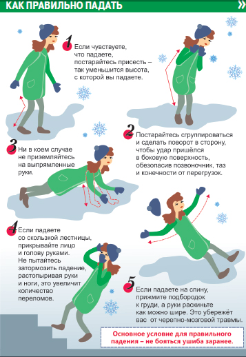 - соблюдать осторожность на улице, не держать руки в карманах, правильно подбирать одежду, обувь, а также избегать скользких мест и опасностей. При падении сгруппироваться, падать на бок, избегая падения на выпрямленные руки. Применять необходимые средства индивидуальной защиты при выполнении работ на открытом воздухе;