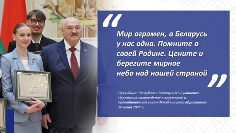 Как отметил белорусский лидер: «Мир огромен, а Беларусь у нас одна. Помните о своей Родине. Цените и берегите мирное небо над нашей страной» (Президент Республики Беларусь А.Г.Лукашенко на церемонии награждения выпускников и преподавателей учреждений высшего образования, 20 июня 2025 г.).