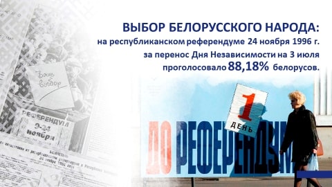 Эту судьбоносную дату закрепили в нашем календаре, опираясь исключительно на мнение белорусских граждан. Это выбор нашего народа: на республиканском референдуме 24 ноября 1996 г. за перенос Дня Независимости на 3 июля проголосовало 88,18% белорусов.