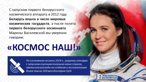 Ведутся работы по созданию российско-белорусского космического аппарата дистанционного зондирования Земли сверхвысокого разрешения до 35 см. При этом практически все наиболее важные компоненты для спутника создаются в Беларуси. В разработке находятся три космические программы Союзного государства. А после полета первого белорусского космонавта Марины Василевской мы уверенно говорим: «Космос наш!».