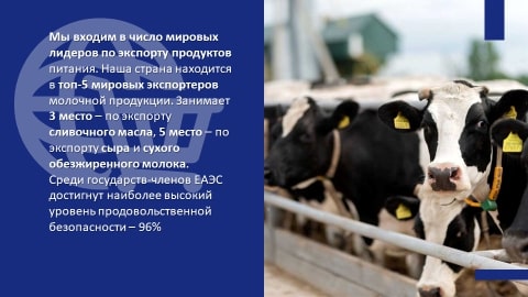 Мы входим в число мировых лидеров по экспорту продуктов питания. Наша страна находится в топ-5 мировых экспортеров молочной продукции. Например, занимает 3 место – по экспорту сливочного масла, 5 место – по экспорту сыра и сухого обезжиренного молока.