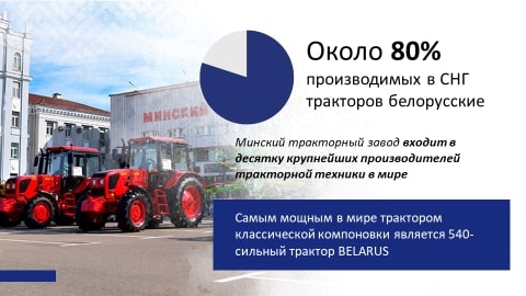 Во всем мире знают трактор BELARUS. К слову, МТЗ обладает мощным техническим и технологическим потенциалом, многолетним опытом создания тракторной и специальной техники. Около 80% производимых в СНГ тракторов белорусские. Минский тракторный завод входит в десятку крупнейших производителей тракторной техники в мире. Самым мощным в мире трактором классической компоновки является 540-сильный трактор BELARUS.