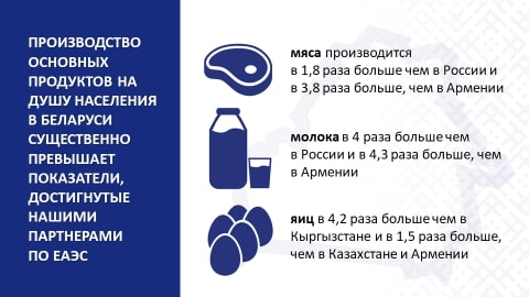 Среди государств ЕАЭС именно в нашей республике достигнут наивысший показатель по уровню самообеспеченности продовольствием. В глобальном рейтинге Беларусь также позиционируется как государство с устойчивым развитием сельского хозяйства и благоприятными условиями обеспечения продовольствия.