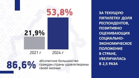 Итоги такой работы находят свое отражение в мнении наших сограждан. По результатам соцопросов, проведенных Институтом социологии НАН Беларуси, за текущую пятилетку доля респондентов, позитивно оценивающих социально-экономическое положение в стране, увеличилась в 2,5 раза (53,8% в 2024 году против 21,9% в 2021 году).