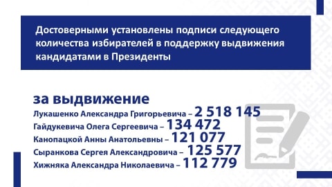 Рубеж в 100 тыс. подписей, необходимых для регистрации кандидатом в Президенты, преодолели 5 инициативных групп (О.С.Гайдукевича – 134 472 подписей, А.А.Канопацкой – 121 077, А.Г.Лукашенко – 2 518 145, С.А.Сыранкова – 125 577,